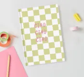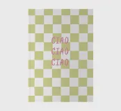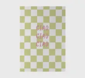 ciao ciao ciao Schriftzug auf Pistazien farbendem check Muster.
