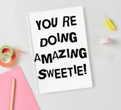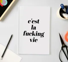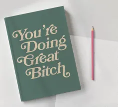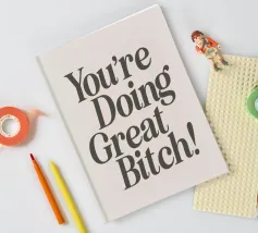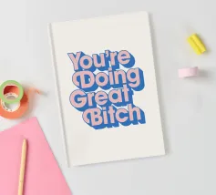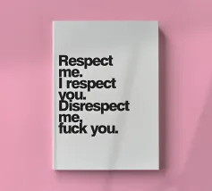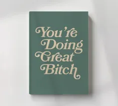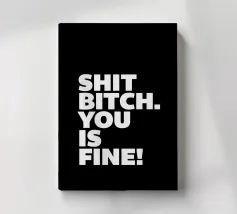 "Die Worte YOU'RE F*CKING LAZY BITCH' stehen in einer fetten, schwarzen serifenlosen Schrift, mit einem Sternchen, das das 'U' in 'FUCKING' zensiert, gefolgt von der Phrase 'PUT DOWN PHONE AND GET UP' in einer kleineren, zarteren Serifenschrift, alles vor einem strukturierten, gebrochen weißen Hintergrund",