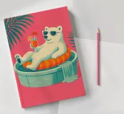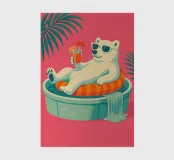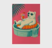 Eine skurrile und lebendige Illustration eines Eisbären, der sein bestes Leben lebt - mit Sonnenbrille, Cocktail in der Pfote und schwimmend in einem Kinderbecken mit einem Mini-Wasserfall. Vor einem tropischen, pinkfarbenen Hintergrund bringt dieses Kunstwerk einen Hauch von Humor und gute Laune in jeden Raum. Perfekt für Liebhaber von schrulliger Kunst, Retro-Ästhetik und entspanntem Lebensgefühl. Ob für Ihr Wohnzimmer, Ihr Büro oder Ihr Sommerhaus - dieses Kunstwerk garantiert ein Lächeln.