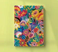 Durch die Verschmelzung von geometrischen Feldern und botanischen Skizzen entsteht ein quiltartiger Dschungel von wilder Gelassenheit.
