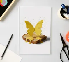 Eine Scheibe Toast trieft von einer großzügigen Menge Honig, dessen goldener Farbton mit dem karierten rosa-weißen Hintergrund kontrastiert. Die einfache, aber lebendige Komposition hebt die klebrige Süße des Honigs hervor, der im Licht glitzert.