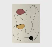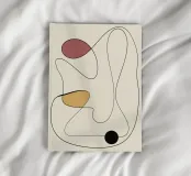 Ein minimalistisches abstraktes Design mit einer durchgehenden schwarzen Linie, die fließende, organische Formen bildet. Drei kräftige, farbenfrohe Formen in Rot, Senf und Schwarz sorgen für Kontrast vor einem hellbeigen Hintergrund.