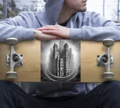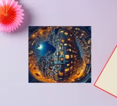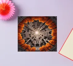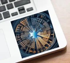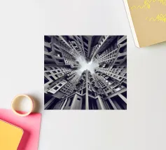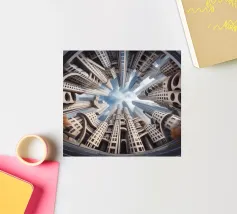 Dieses Bild zeigt eine beeindruckende kreisförmige architektonische Anordnung mit hohen, modernisierten klassischen Gebäuden, die zum Himmel hin konvergieren. Eine prominente Statue in der Mitte verstärkt die dramatische Perspektive unter einem wolkenverhangenen blauen Himmel.
