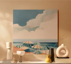 Eine heitere Illustration eines ruhigen Strandes, der in warme Töne getaucht ist. Sonnenhüte ruhen im Sand, und rustikale Hütten vervollständigen die friedliche Szene und fangen das Wesen der langsamen Sommertage ein.
