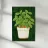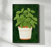 Das Bild zeigt eine üppige grüne Basilikumpflanze mit breit geäderten Blättern in einem weißen Topf mit rotbraunem Sockel. Der Hintergrund ist dunkelgrün und texturiert, was dem Motiv Tiefe verleiht. Der Stil kombiniert realistische botanische Details mit einem malerischen, leicht abstrahierten Look. Die Illustration wirkt lebendig und zugleich beruhigend – ideal für dekorative Zwecke oder als Teil einer naturinspirierten Serie. Die Farbwahl und Textur erzeugen eine warme, organische Atmosphäre.