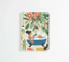 This image shows a person taking a bath in a tub surrounded by plants and a cat, with a cup and book nearby. The cozy and tranquil atmosphere makes it a comforting and pleasant scene.