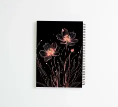 A minimalist, ethereal depiction of cosmos flowers, their delicate petals illuminated by a soft, glowing light against a dark background.