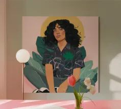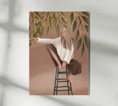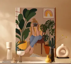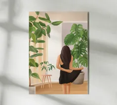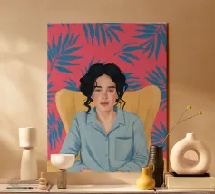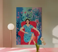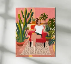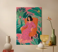 Das Porträt einer Frau, die auf einem roten Stuhl sitzt, eingerahmt von großen, üppigen Monstera-Blättern. Ihre nachdenkliche Pose und ihr ruhiger Gesichtsausdruck vermitteln ein Gefühl der Selbstbetrachtung und Klarheit. Weiche, erdige Töne und natürliche Elemente verbinden modernen Minimalismus mit botanischer Schönheit und machen dieses Kunstwerk perfekt für zeitgenössische Innenräume.