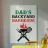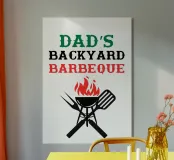 The image features a simple design with the text "Dad's Backyard Barbeque" in bold, stylized letters. The words "Dad's" are in green, "Backyard" in black, and "Barbeque" in red. Below the text, a black silhouette of a grill with flames, a spatula, and two forks is depicted. The image is set against a white background, creating a clean and minimalist aesthetic.