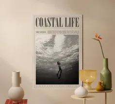 Dieses minimalistische Unterwasserposter fängt einen Moment absoluter Ruhe und Kontrolle ein. Ein einsamer Freitaucher taucht senkrecht durch geschichtete Formen und gedämpfte Meeresfarben hinab und symbolisiert dabei Konzentration, Disziplin und Vertrauen in den eigenen Atem. Die geometrischen Überlagerungen verleihen dem Bild einen modernen, abstrakten Charakter, während die tiefen Blautöne und sandigen Neutraltöne ein Gefühl von Tiefe und Stille erzeugen. Perfekt für Liebhaber des Freitauchens, Surfens, des Wassersports oder alle, die sich von ruhigen, introspektiven Bildern angezogen fühlen.