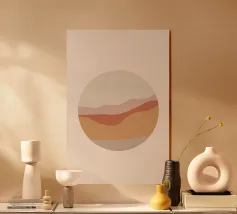 Ein beruhigendes, abstraktes, kreisförmiges Mandala mit warmen Erdfarben und einem ausgewogenen geometrischen Design. Dieses Kunstwerk verkörpert erdende Energie, Achtsamkeit und inneren Frieden - perfekt, um in jedem Raum eine heitere, Zen-inspirierte Atmosphäre zu schaffen. Ideal für Meditationsräume, Yogastudios oder gemütliche moderne Interieurs.abstrakter retro-moderner Kunstdruck, orange-braune Pastellfarben.
