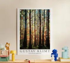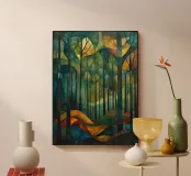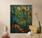This vibrant and abstract painting captures the essence of a serene forest, with its intricate patterns of trees and colorful foliage. The use of geometric shapes and bold colors creates a visually stunning piece that will add a touch of nature to any space.