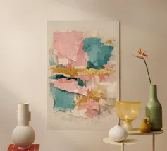 Ein ausdrucksstarkes abstraktes Gemälde, in dem kühle Blautöne und zarte Rosatöne in einer vielschichtigen Textur aufeinandertreffen. Dieses Kunstwerk verleiht modernen Räumen Tiefe, Emotionalität und einen zeitgemäßen Charakter.