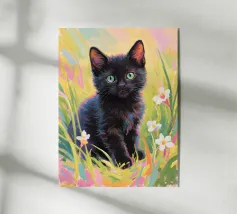 This black cat in a Darth Vader helmet combines pop culture with classic painting: the gloomy helmet meets softly painted flowers and delicate brushstrokes - an unusual mixture of menace and idyll. A humorous, stylish statement for anyone who loves cats and knows the dark side. Perfect for modern living spaces with a wink.