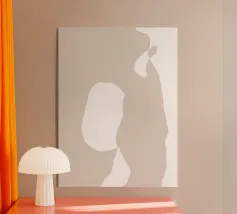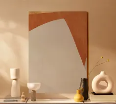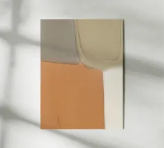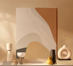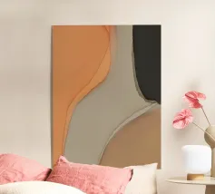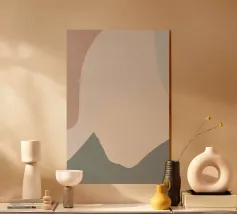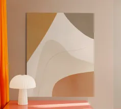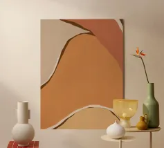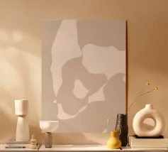 Weiche, fließende Formen in Erdtönen überlagern sich zu einem abstrakten Muster. Die Komposition verwendet eine Palette von Beige-, Braun- und Grautönen, die eine beruhigende und harmonische Wirkung haben.
