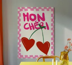 Cherries with dark red saying from chéri (my favourite). Generated with AI (Canva), among other things.