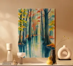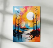This vibrant abstract painting captures the essence of a serene landscape. A large, white moon dominates the sky, casting a soft glow over the scene. Silhouettes of trees stand tall against a backdrop of swirling colors, creating a sense of mystery and tranquility. The winding river, reflected in the moon's light, adds a touch of dynamism to the otherwise peaceful composition.