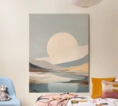 This serene landscape painting captures the beauty of nature in a minimalist style. Soft, muted colors create a calming atmosphere, while the intricate details of the mountains and the water's edge invite contemplation. The large, luminous moon adds a touch of magic to the scene, making it perfect for any home or office space.