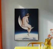 Moonwatcher is a thought-provoking wall art piece that delves into themes of love, connection, and the passage of time. This artwork features a mesmerizing depiction of the moon and her guardian.