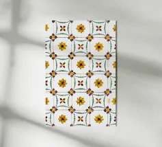 This artwork captures a striking tile pattern from Matosinhos, Portugal, where geometric forms and retro colors come together in perfect harmony. The abstract design, with tones of ochre, lavender, olive, and cream, reflects a mid-century modern aesthetic while carrying the cultural heritage of traditional Portuguese azulejos.