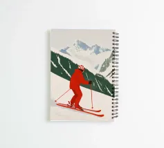 The picture shows a dynamic winter sports scene: a person in eye-catching red ski clothing skis down a snow-covered mountain slope. The clear lines and bold colours give the illustration a modern, almost graphic style. The snow-covered mountains and the stylised fir trees in the background create an atmospheric backdrop that emphasises movement and closeness to nature at the same time. It looks like a mixture of sporting energy and scenic tranquillity.
