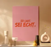 Mut zur Authentizität! „Sei laut. Sei echt.“ in orange auf rosa Hintergrund erinnert daran, du selbst zu sein und keine Kompromisse einzugehen.