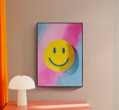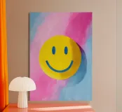 Colourful smiley face on a pink and blue background, hand-painted in a minimalist oil style. Perfect for children's rooms, children's books or cheerful room decorations. Bright colours, simple shapes and dreamlike scenes for a good mood.