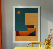 A minimalist illustration of modern architecture in warm shades of orange and yellow, contrasting with a deep blue sky and glowing sun. The clean geometric lines and bright colours create a striking, contemporary composition, ideal for evoking elegance and modernity in a unique artistic style.