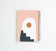 An abstract composition features geometric shapes, including a black staircase pattern ascending through a white arch against a soft pink background. A solid brown circle is positioned near the top, adding a focal point to the minimalist design.