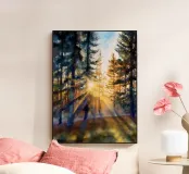 Golden morning light filters through towering pines, casting long shadows that feel both eternal and ephemeral. This watercolor captures the fleeting magic of daybreak in the forest — a gentle reminder of the beauty that stillness brings.
