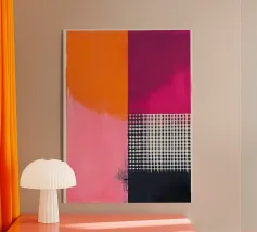 Leuchtendes Orange trifft auf verlaufendes Pink: Dieses abstrakte Werk kombiniert geometrische Klarheit mit kontrollierter Unschärfe. Fünf vertikale Streifen scheinen aus dem orangen Block zu tropfen – wie Hitze, Energie oder Emotion. Das Werk wirkt gleichzeitig kontrolliert und impulsiv – ideal für moderne Räume mit Power, Dynamik und Farbmut.