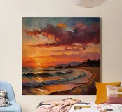 Der Himmel leuchtet in karminroten, lavendelfarbenen und tiefblauen Tönen und spiegelt sich sanft auf der Wasseroberfläche. Eine warme Brise trägt den Duft von Salz und fernen Küsten mit sich, während Möwen lautlos gegen den glühenden Himmel gleiten. In diesem flüchtigen Moment hält die Welt den Atem an - gebadet in der stillen Majestät eines Sonnenuntergangs über dem Meer.
