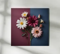 Ein spiralgebundenes Notizbuch mit drei rosafarbenen Blumen und grünen Blättern auf einer bunten Holzoberfläche lädt zu Kreativität und Inspiration ein.