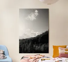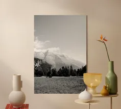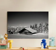 A tranquil black-and-white photograph capturing the sunlight breaking through a dense forest, casting long shadows over a pristine, snow-covered hillside. A minimalist and timeless addition to your wall.