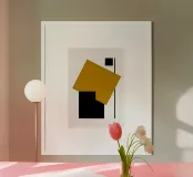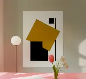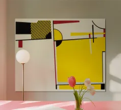 A striking abstract composition inspired by Bauhaus design, featuring bold red and black geometric forms arranged in a dynamic balance. Clean lines and strong contrasts create a timeless modern aesthetic.