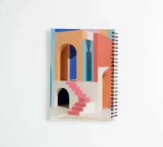 A surreal architectural composition of arches, stairs, and doorways in a soft pastel palette of pink, blue, and beige. A lone palm tree adds a touch of nature to this tranquil and dream like labyrinth.