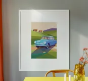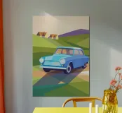 Holen Sie sich eine Illustration von einem blauen Oldtimer fahren in der Landschaft mit einem Hintergrund von Häusern und Hügeln mit einem modernen geometrischen Stil.