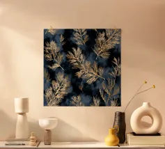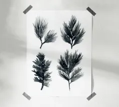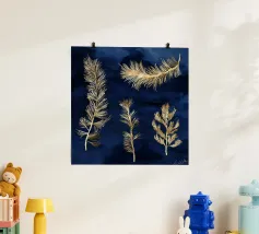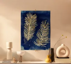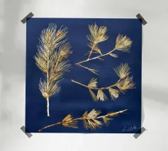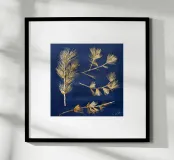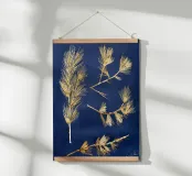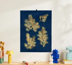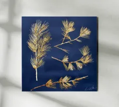 Eine Studie über das ruhige Design der Natur - diese zart angeordneten Kiefernfragmente schweben vor einem tiefen, samtigen Blau. Die Komposition erinnert sowohl an botanische Präzision als auch an die anmutige Zufälligkeit von Waldbodenfunden.
