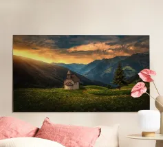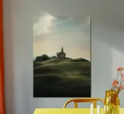 Umgeben von weiten Wiesen und sich wiegendem Gras, überblickt es das Tal mit ruhiger Anmut. Die Luft ist still, erfüllt vom Duft der Wildblumen und dem fernen Gesang der Vögel. Das schlichte Kreuz der Kapelle ragt in den Himmel, ein Symbol der Ruhe und Einsamkeit.