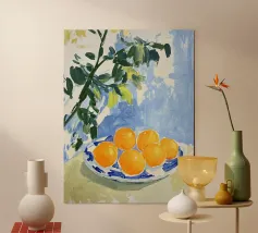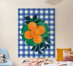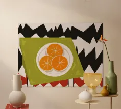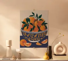 Mandarin-Orangen in einer Glasschale auf einem geometrisch gemusterten Tuch verbinden Frische und Kühnheit.