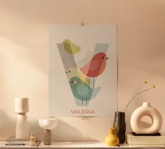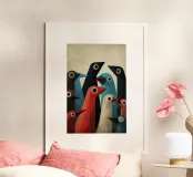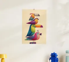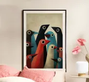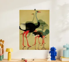 Abstrakte Vogelkunst mit geometrischen Formen in gedeckten Farben.
