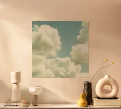 Dieser stilvolle Holzrahmen Kunstdruck von Mareike Böhmer Photography zeigt eine sanfte Darstellung weißer Wolken vor einem neutralen Hintergrund. Perfekt für das Schlafzimmer oder den Wohnbereich, bringt er eine beruhigende Atmosphäre in Ihr Zuhause.