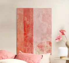 This abstract composition is built around a gentle tension between bold coral-red and softened blush tones, interrupted by a luminous white passage. The colors meet and overlap in broad, painterly blocks, creating a sense of structure without rigidity. The palette remains warm and cohesive, with the white acting as a quiet breath within the field of color.