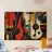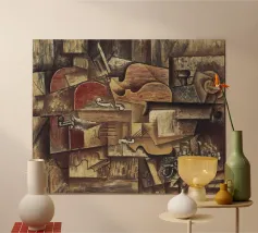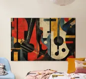 Ein modernes abstraktes Gemälde mit geometrischen Formen, die Gitarren, Geigen und Musiknoten in einer kühnen, farbenfrohen Komposition darstellen. Der strukturierte Hintergrund und die dynamische Anordnung wecken ein Gefühl von Rhythmus und künstlerischem Ausdruck.
