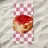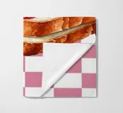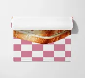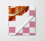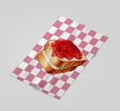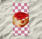 Ein Stapel von drei Toastbrotscheiben mit einer großzügigen Schicht leuchtend roter Marmelade auf der Oberseite befindet sich vor einem rosa und weiß karierten Hintergrund. Die realistische Darstellung des Brotes kontrastiert mit dem verspielten, geometrischen Hintergrund.