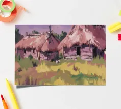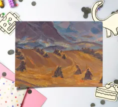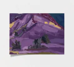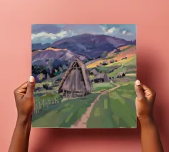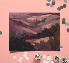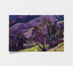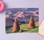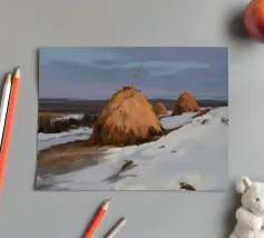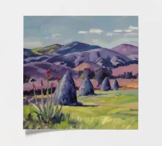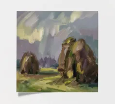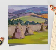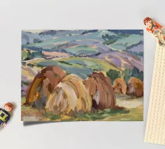 Eine ruhige Landschaft, in deren Mittelpunkt ein wohlgeformter Heuhaufen in einem Feld steht, das von sanften Hügeln in gedämpften Lila- und Grüntönen unter einem sanften, ruhigen Himmel geprägt ist.
