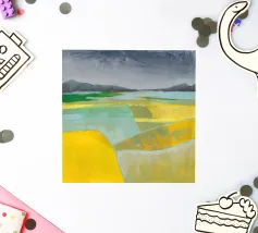 Ein malerischer Blick auf hügelige Patchwork-Felder, die in kräftigen Pastelltönen gehalten sind und eine traumhafte Landschaft schaffen.