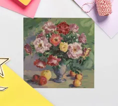 Ein kühnes Stillleben mit leuchtend rot-rosa Blumen, möglicherweise Mohn oder Geranien, in einer einfachen Vase, zusammen mit frischen grünen Birnen, alles auf einem satten roten Tischtuch, das in starkem Kontrast zu einem tiefblauen Hintergrund steht.