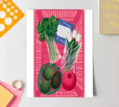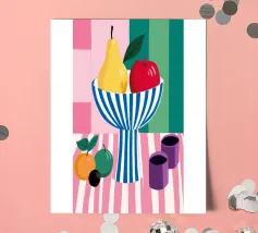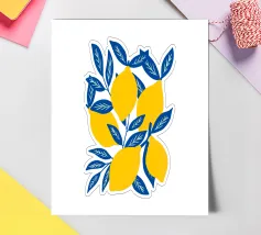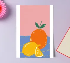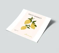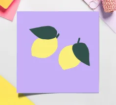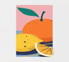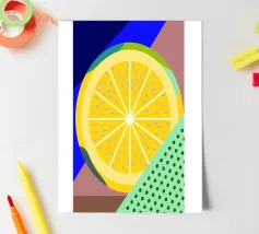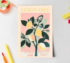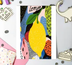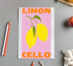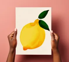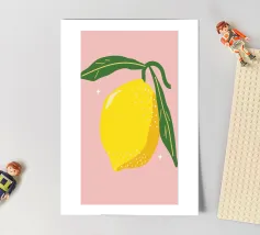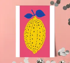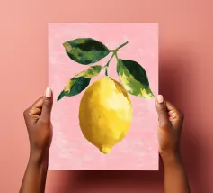 Eine große, einzelne gelbe Zitrone, illustriert mit einem strukturierten, düsteren Stil vor einem leuchtend rosa Hintergrund. Das Werk ist eine kühne, moderne und grafische Pop-Art-Interpretation einer klassischen Frucht.