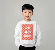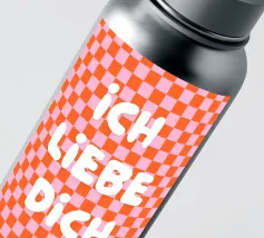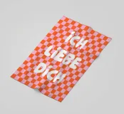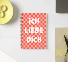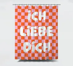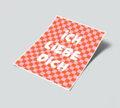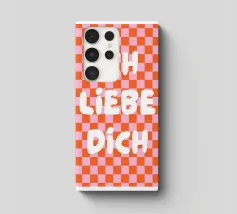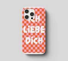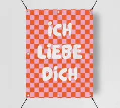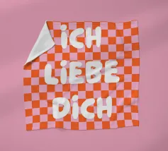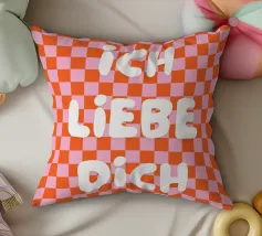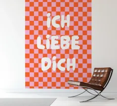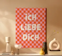 Ich liebe dich, deutsches Liebeszitat, deutsche Typografie, Liebesphrase Design, rosa und oranges Karomuster, Retro-Schachbrett-Stil, fette verspielte Schrift, romantischer deutscher Spruch, süße Liebesbotschaft, farbenfrohes Typografie-Design